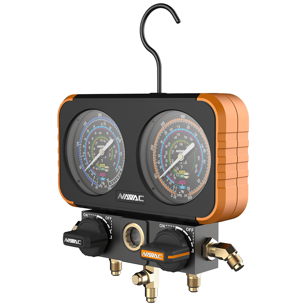 Navac Manifold Gauge, Class 1.0 Accuracy, -30 inHg to 800 psi, -30 inHg to 500 psi, Aluminum, Additional Information: 3-1/8 in Dia Gauge, R-454B/R-32/R-410A/R-22 Refrigerant Type