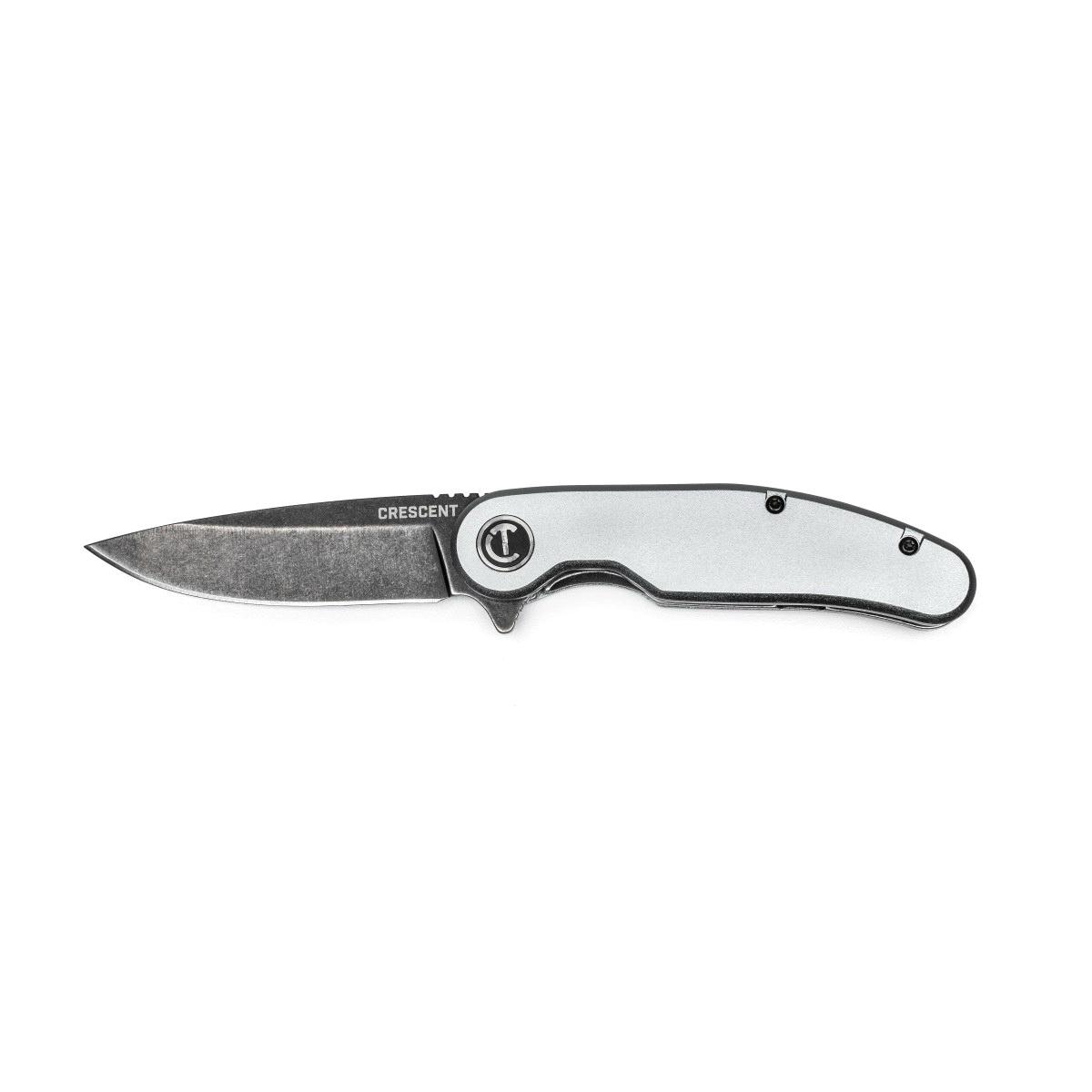 CRESCENT® Pocket Knife, 1 Blades, Drop Point Blade, 3-1/4 in Blade Length, Steel Blade, Stone Washed Blade, Ergonomic Handle, Aluminum Handle, Silver Handle, 4 in Handle Length, 8 in Overall Length